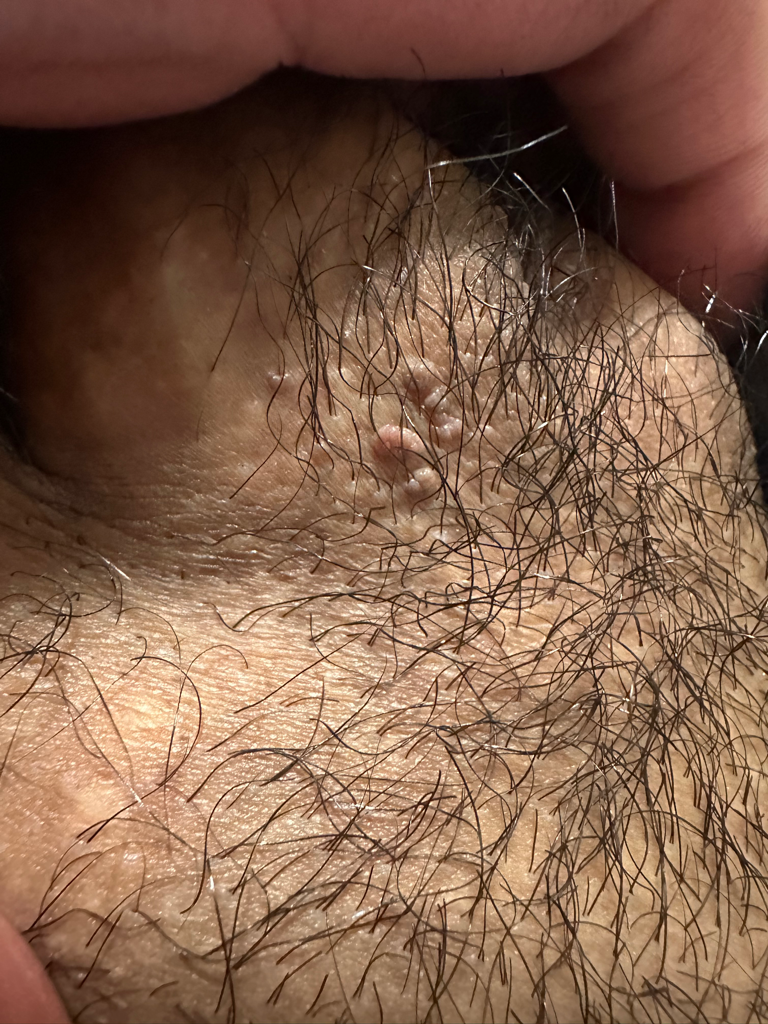헤르페스의 물집, 수포성 병변과는 다소 차이가 있어보이며 곤지름의 가능성도 고려해보셔야 하겠습니다. 피부과진료를 보시기 바랍니다.