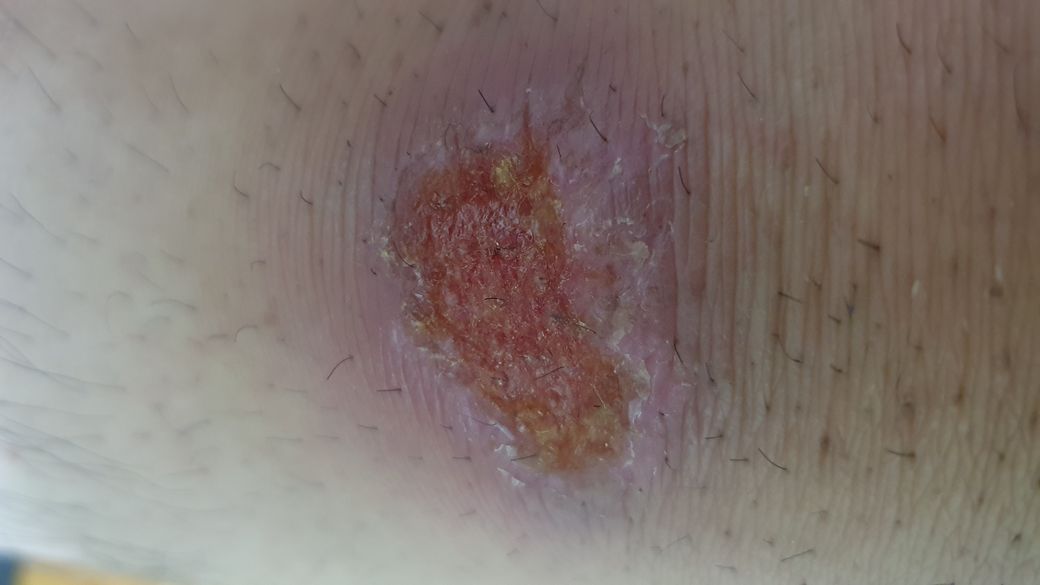 아직도 진물이 많이 나오는것같습니다. 메디폼과 같은 흡수성 폼을 이용해서 드레싱 해주는게 좋겠습니다..