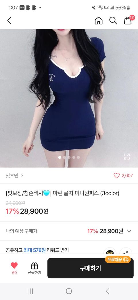 소재가 얇아서 몸매 라인이 다 드러나고, 가슴이 생각보다 많이 파여 있으며 원피스 길이도 그렇게 길지가 않아 속바지가 다 비칠 수도 있겠네요.