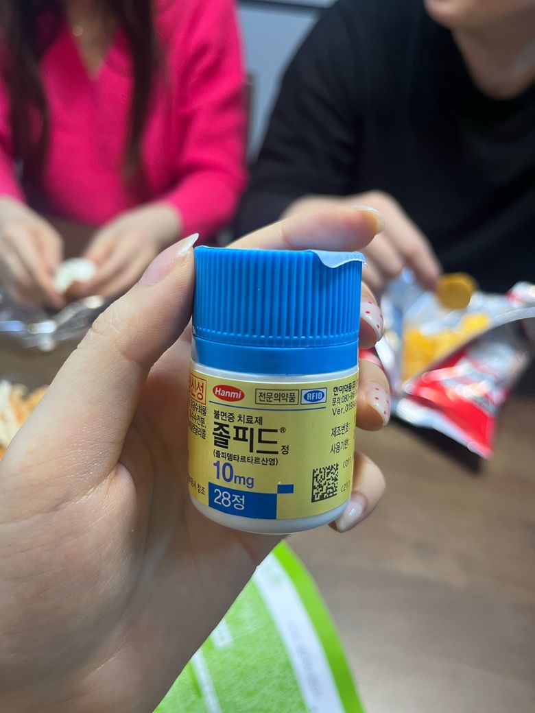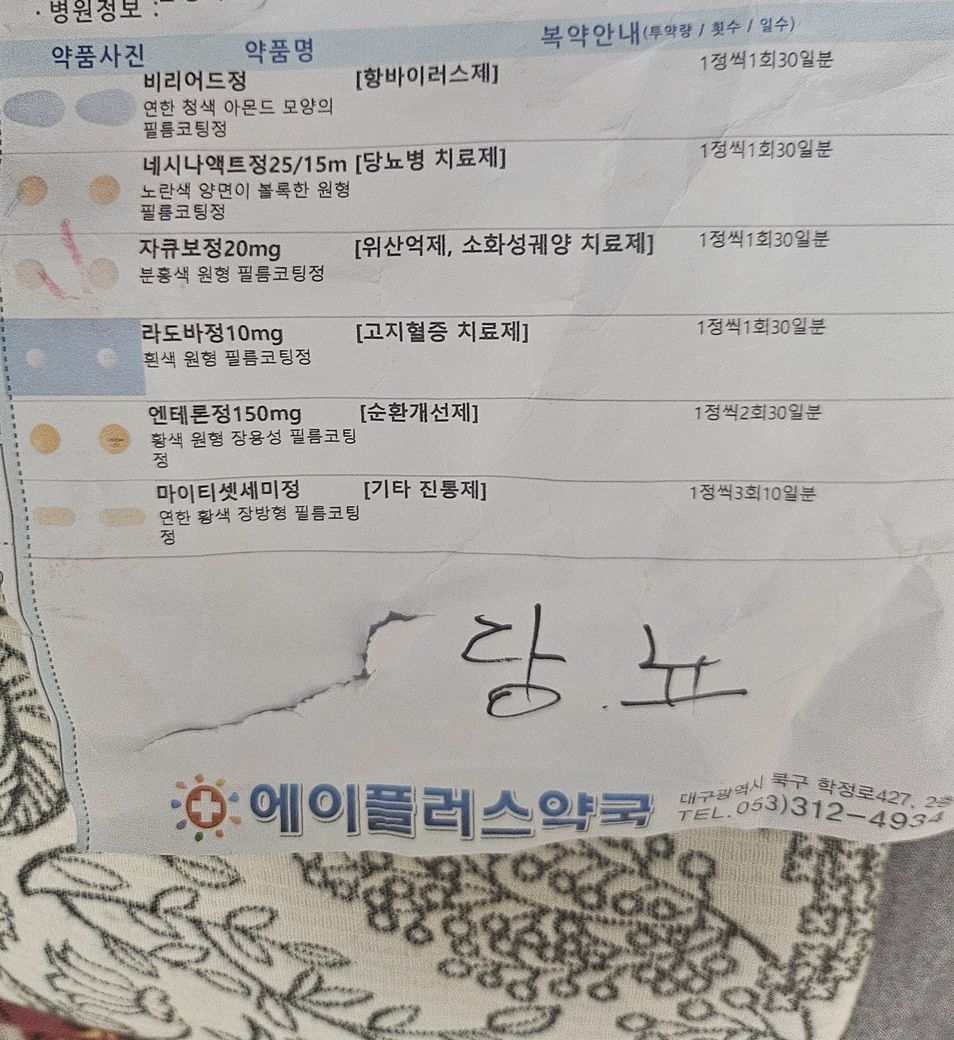 사진에 보이는 약을 정리하면, 비리어드정(테노포비르, B형간염 치료제), 네시나메트(당뇨약), 라도바정(고지혈증), 엔테론(혈관·부종 관련 약), 마이티셋세미정(진통제), 자루보정 및 대웅라베프라졸(위장약), 졸피드정 10mg(졸피뎀, 수면제) 등이 포함되어 있습니다. 기저질환 자체로도 약이 많은 편인데, 여기에 수면제와 진통제가 더해지면 고령·간경변 환자에서는 부작용 위험이 상당히 높습니다.
