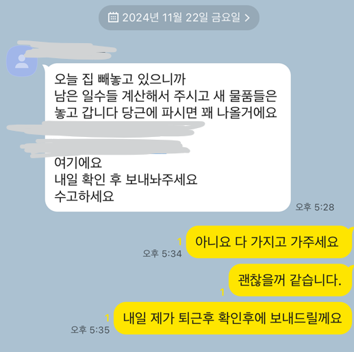 세입자가 새 물건들은 놓고 간다며 당근에 팔라고 해서 필요없다고 다 가지고 나가주세요 라고 전했습니다.