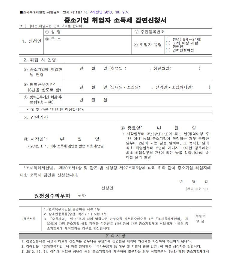 중소기업 취업자 소득세 감면신청서 서류 질문드립니다 !!회사에 제출해야하는서류는 신청서 1장외 , 추가로 어떤것이있는지요??그리고 감면기간란에 (이제 받기시작하려고 ) 하는데 날짜를 어떻게 기입해야하나요? 없으면 비워둬야하나요?..