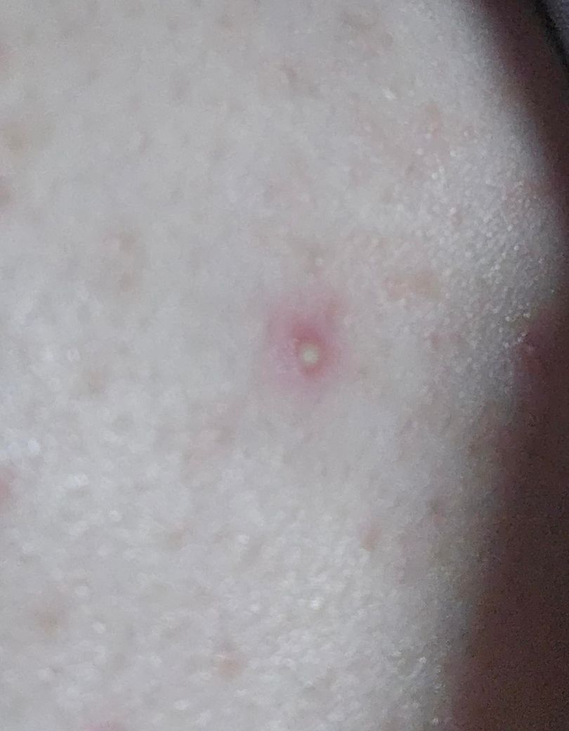 사진상 병변은 중심에 황색 농포가 형성된 소농포로 보이며, 접촉성 피부염 부위에 2차 세균감염이 동반된 모낭염 또는 국소 농포 가능성이 있습니다. 접촉성 피부염은 피부 장벽이 손상되어 세균 감염이 쉽게 동반될 수 있습니다.