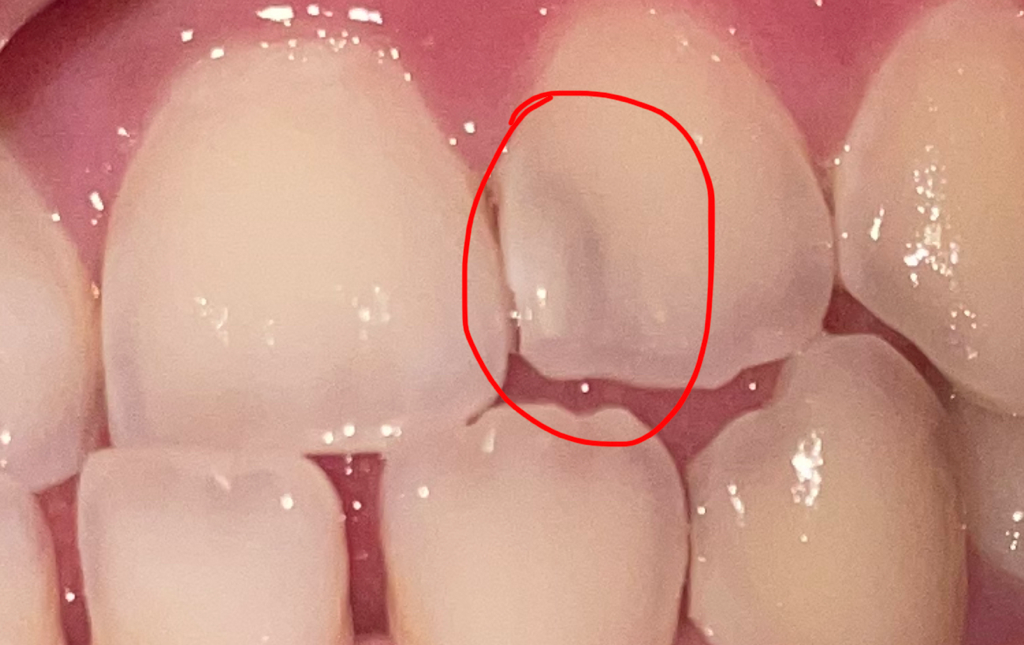 뒤쪽에서 충치가 생긴 것으로 보이며, 충치가 어느 정도 진행된 것으로 보입니다. 빨리 치료해야 합니다. 충치 진행된 정도에 따라 그냥 떼우기만 하거나, 안쪽으로 많이 진행되었으면 신경치료 까지 해야 합니다.