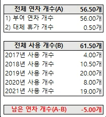 이전년도에 이월 된 연차를 포함해 올해 23개 연차를 지급받았고 19개를 사용한 상황입니다
