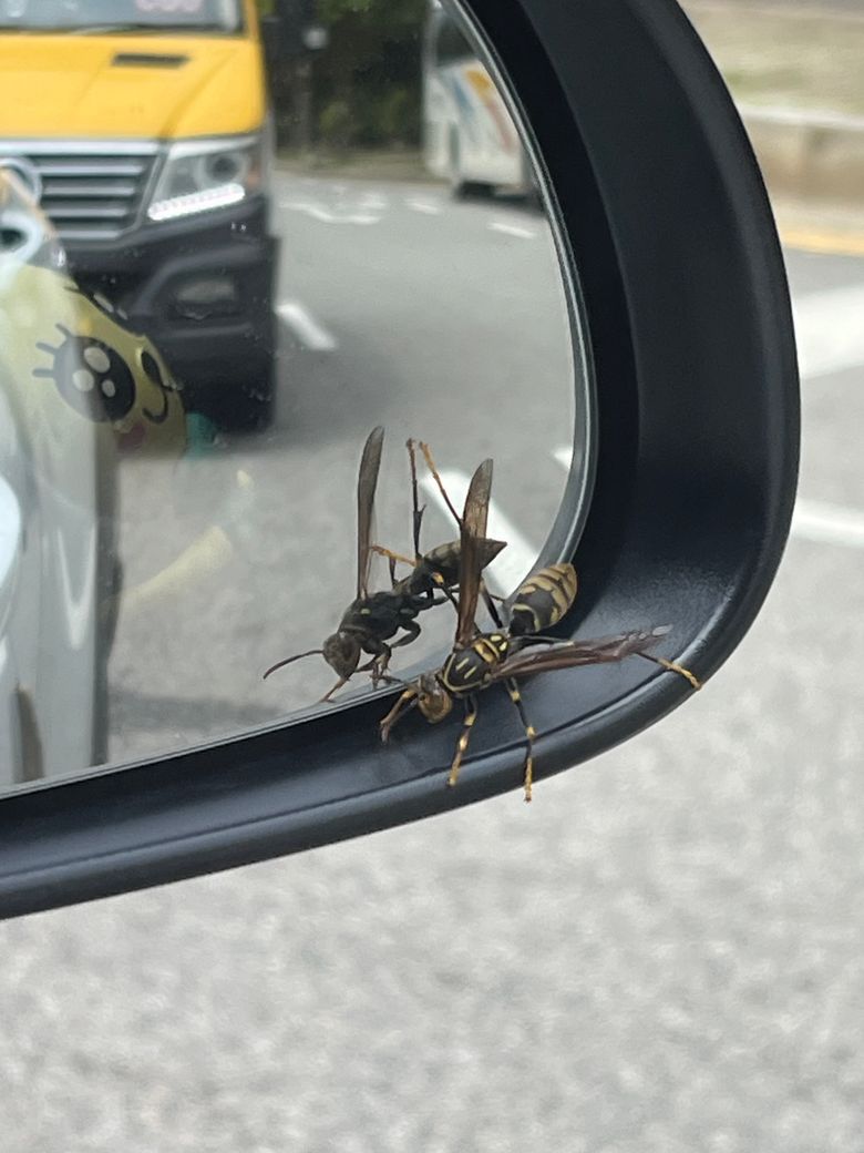 어느 순간 보니까 백미러에 달라붙어 있었어요 어떤 벌레인가요? 결국 주차장에서 힘 다빠진 친구를 톡 쳐서 내려뒀네요… 위험한 친구인가요?