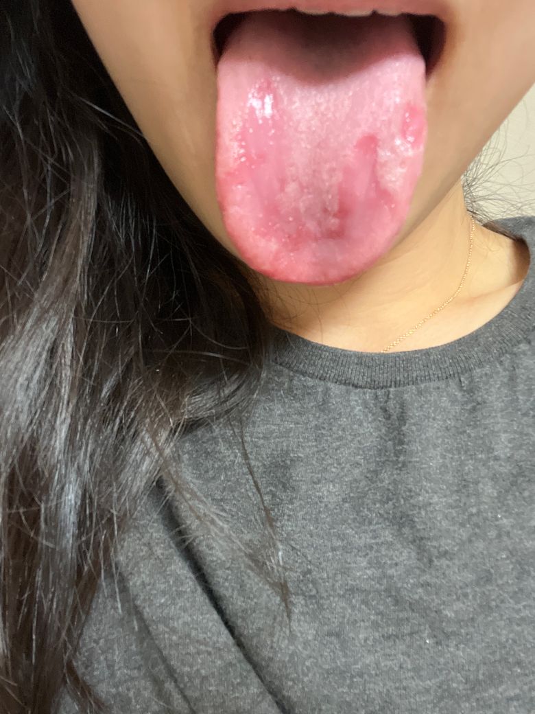 사진처럼 혓바닥이 까져 있습니다.