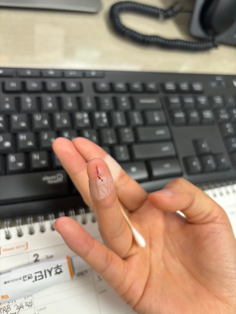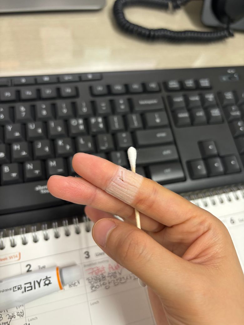 보니까 탄내가 나면서 한쪽은 다소 깊은 구멍이 작게 났고, 한쪽은 찢어져 피가 흘렀습니다. 이게 어제 일이고 후시딘과 밴드로 조치 취했습니다.