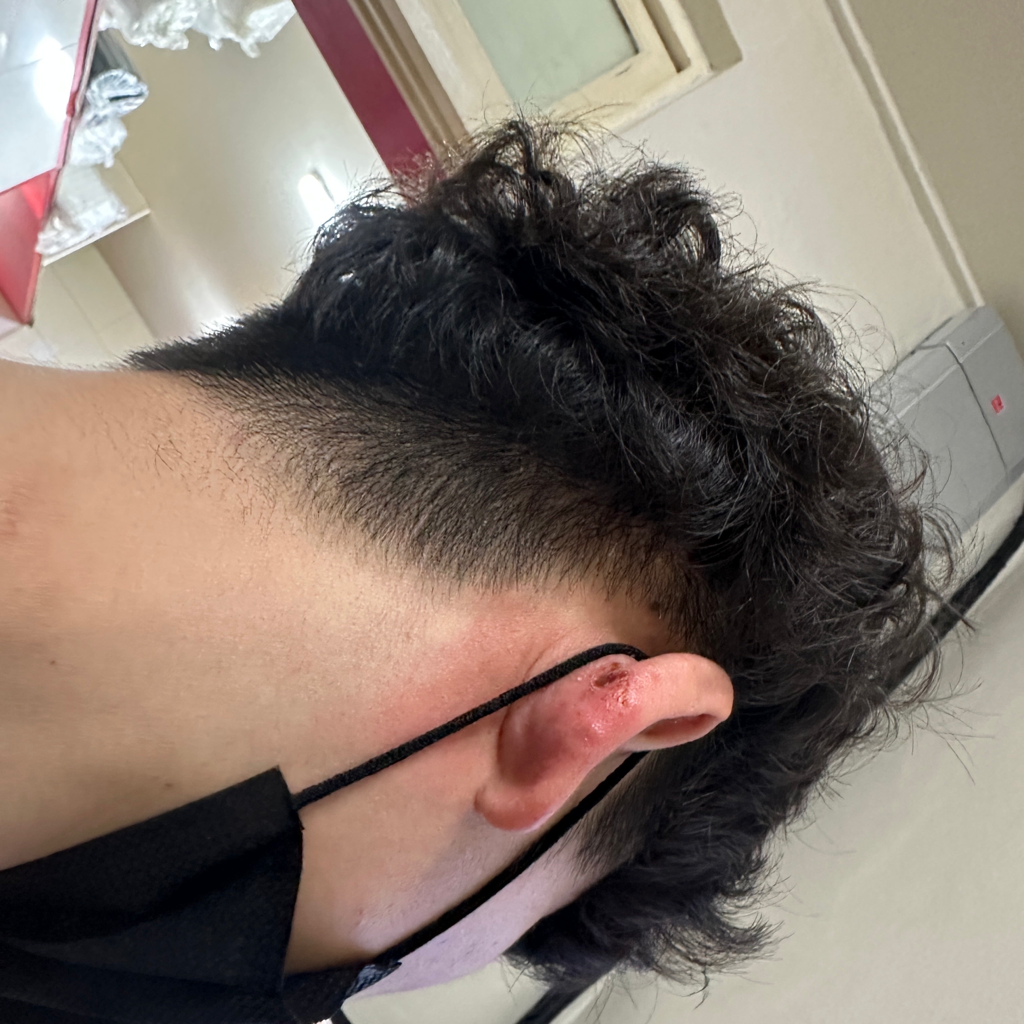 사진의 소견으로 정확한 상태를 알 수는 없지만 귓바퀴 부위에 염증 및 농양이 발생한 것으로 사료됩니다. 관련하여서는 제거 시술 및 항생제 등 약물 치료가 필요할 것으로 사료됩니다. 이비인후과에서 진료 및 적절한 치료를 받으시길 권고드립니다.