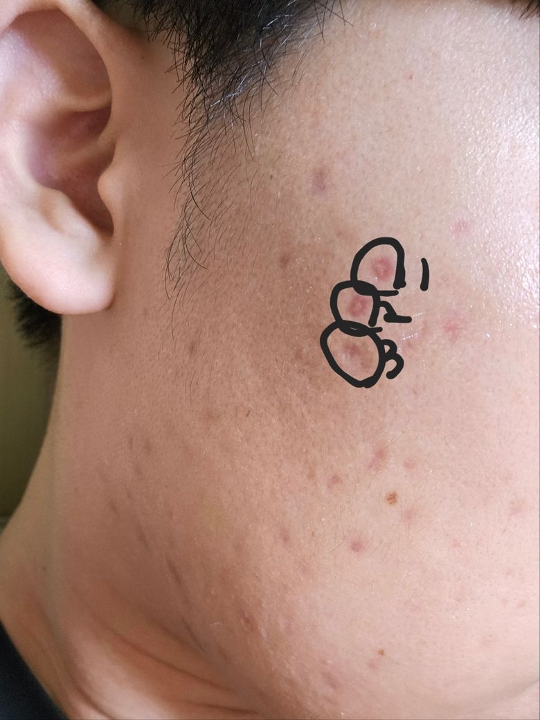 제 얼굴 사진인데요 4달전에 여드름 갑자기 많이 나서 병원가서 약 먹고 바르는약도 발랐는데 현재는 색소 침착만 남아 있는데 제가 숫자로 표시한 1,2번이 다른 애들이랑 다르게 더 붉고 위에 흰 막? 같은게 계속 생기고 누르면 아픈 느낌이나요 얘네는 왜그런거죠?? 그리고 해결 방법은 뭔가요? 또 3번은 찾아보니깐 박스카 흉터랑 비슷하던데 그건가요? 얘도 집에서는 못 없애나요?ㅠㅠ