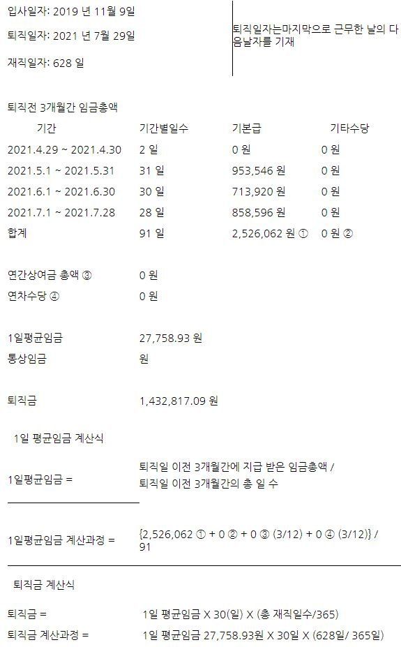 질문하신 내용에 대하여 아래와 같이 답변 드립니다.퇴직금 = 일일평균임금 × 30일 × 재직일수