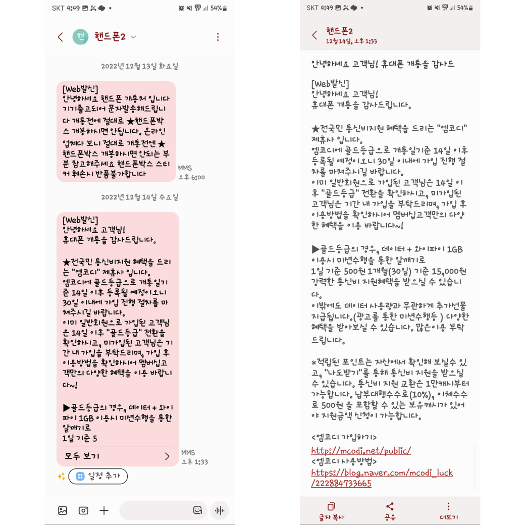 그래서 1월 6일 금요일 오후 3시쯤 남편이 1. 단말기 가격이 왜 그대로인지, 2. 한 달에 단말기 할부금이 1만6천원 가량이라고 했는데 통신사 앱에 그렇게 적혀져 있지 않은 점, 3. 할인은 통신할인요금(선택약정할인)이 전부인 점을 문의했고, 그때 '엠코디'라는 어플을 언급하며 제게 이미 모두 설명을 했고, 그 어플로 할인을 받는 것이라고 말했습니다. 통신사 직영판매점에 가서 계약 정보를 확인하고, 상황 설명을 하니 사기가 맞고, 공시지원 계약은 돼 있지 않다고 합니다.