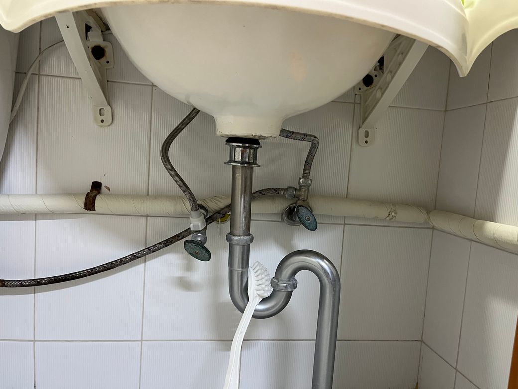 그러던 중 아래에 배관을 발견했는데, 흰색 커버로 감싸진 배관이 온수관인것 같습니다. 해당 배관에서 세면대로 올라가는 호스 하나, 벽에서 나오는 구멍과 연결된 호스 하나가 있고