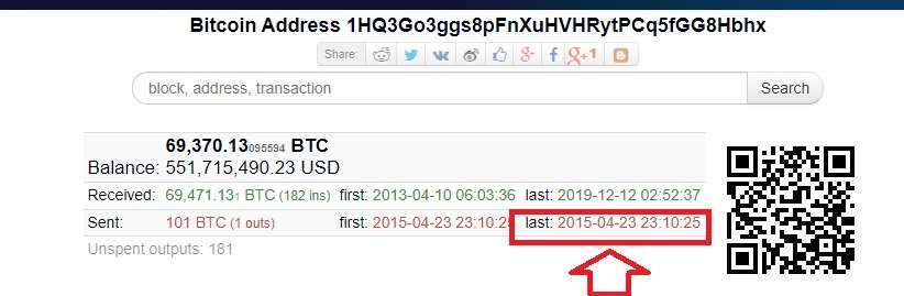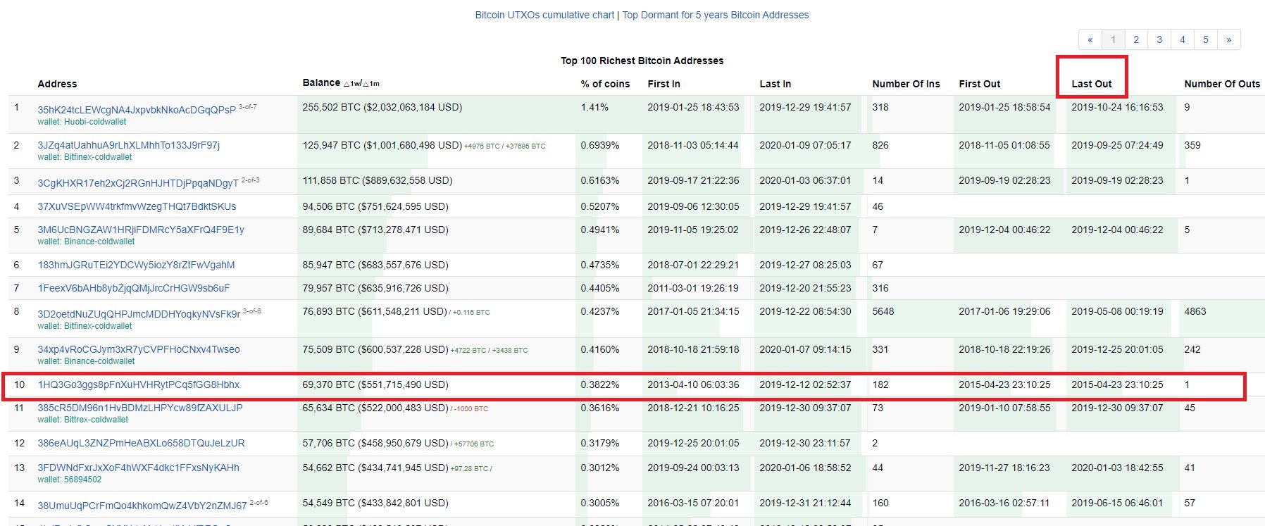 현재 비트코인 보유지갑중 10위를 차지하고 있는 https://bitinfocharts.com/bitcoin/address/1HQ3Go3ggs8pFnXuHVHRytPCq5fGG8Hbhx 지갑의 경우 현재 약 69,370개의 비트코인을 보유하고 있는데 마지막으로 출금이 된것은 2015년 4월23일로 나오고 있기 때문에 휴면상태임을 알수 있습니다.