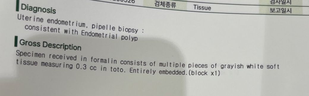첨부하신 사진의 진단을 해석하면, " 자궁내막 조직검사 결과 자궁내막 폴립(endometrial polyp)과 일치" 한다고 진단되었습니다.