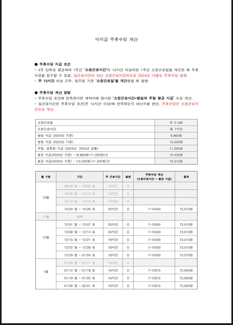2024년 10월부터 2025년 6월까지 주휴수당을 받지 못 했습니다. 노동청에 진정 접수 후 못 받은 주휴수당 계산하는 도중에