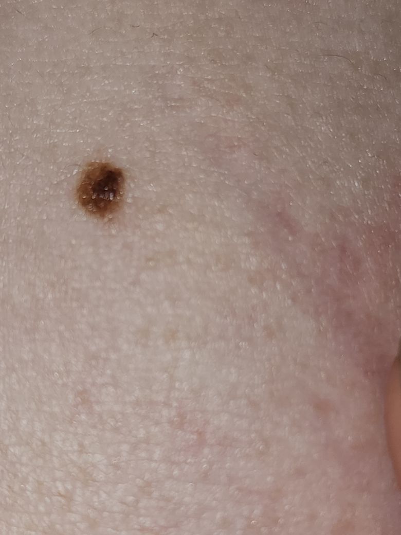 5년간 크기의 변화도 없었고 생긴 모양 또한 경계가 분명하며 찌그러져 있지 않고 튀어나와 있지도 않아 흑색종의 가능성이 매우 낮아 보입니다. 그냥 점처럼 보입니다.