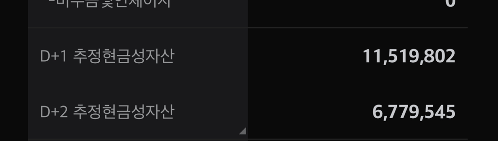 D+1영업일뒤에 입금될 추정현금성자산이라는 것은 전영업일에 거래를 했었던 결과물이다 보니 출금은 불가능한 상태를 말하는 것이에요.