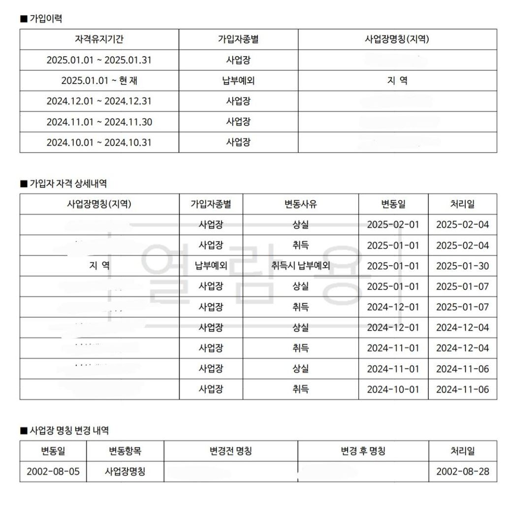 국민연금 가입증명서 떼보니 저렇게 한 달 간격으로 근로자 구한 것처럼 서류작업 하셔서, 지금 신고 전이라 연금•고용•산재 미가입 상태입니다.