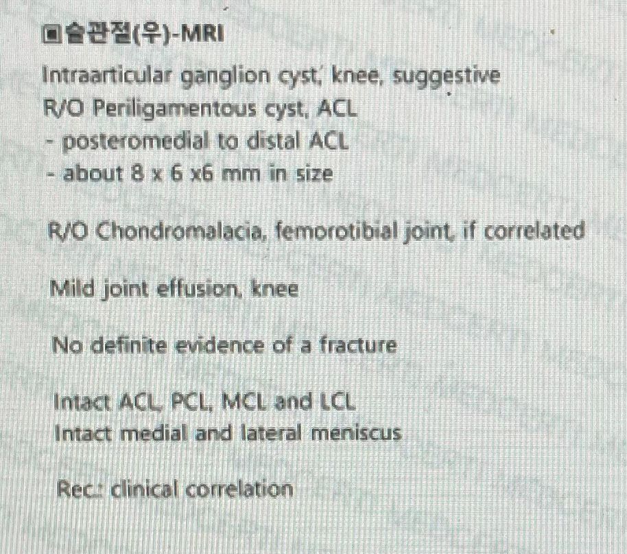 현재 관절내 물혹이 관찰되고 있으며 관절내 삼출물이 관찰되며 골절은 관찰되지 않습니다. 인대와 반월판은 모두 양호한 것으로 보인다고 판독되어 있습니다.
