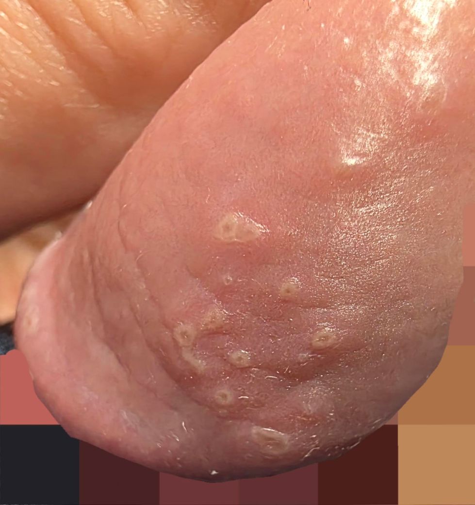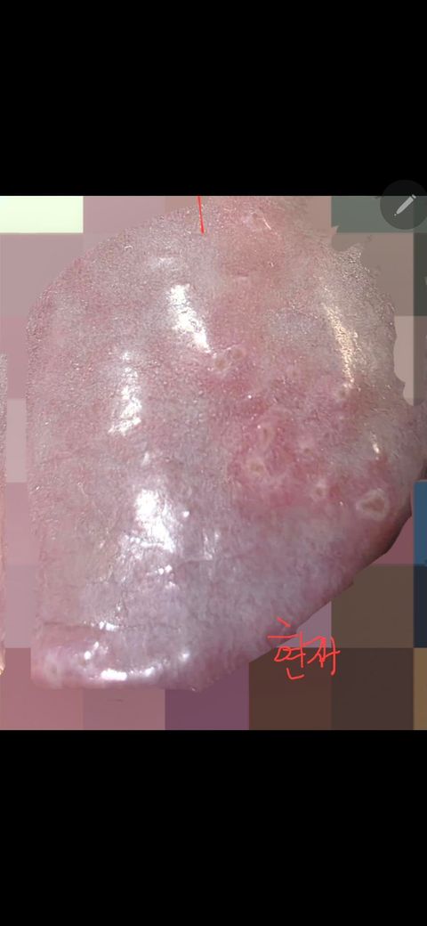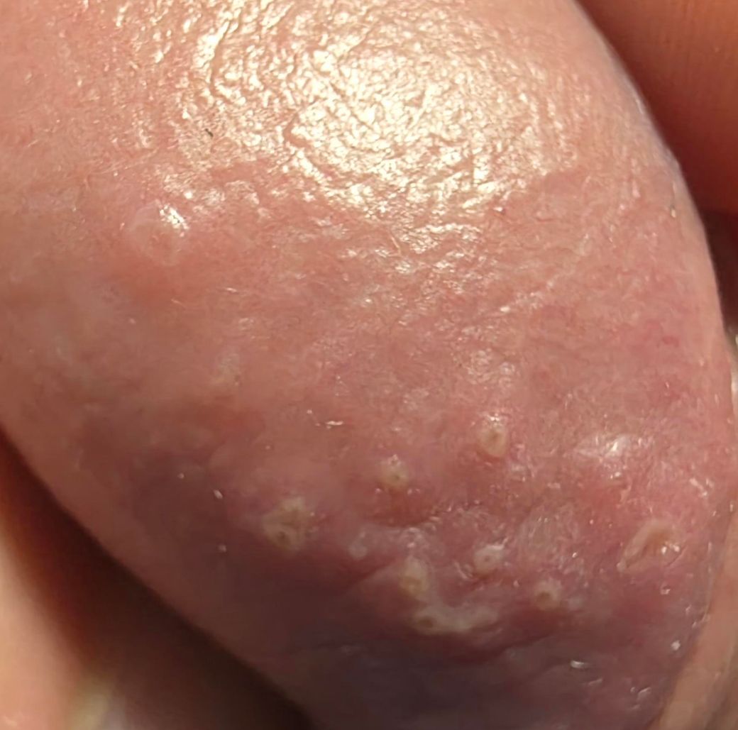 현재 병변은 작은 얕은 미란들이 군집해 있는 형태로, 전형적인 생식기 헤르페스의 맑은 수포 군집과는 완전히 일치하지는 않습니다. 다만 수포가 이미 터진 이후 단계라면 이렇게 보일 가능성은 있습니다. 통증이 심하지 않고 눌렀을 때만 약간 따가운 정도라는 점은 전형적인 1차 감염과는 다소 거리가 있습니다. (중간 정도의 가능성이라고 말씀드리겠습니다.)