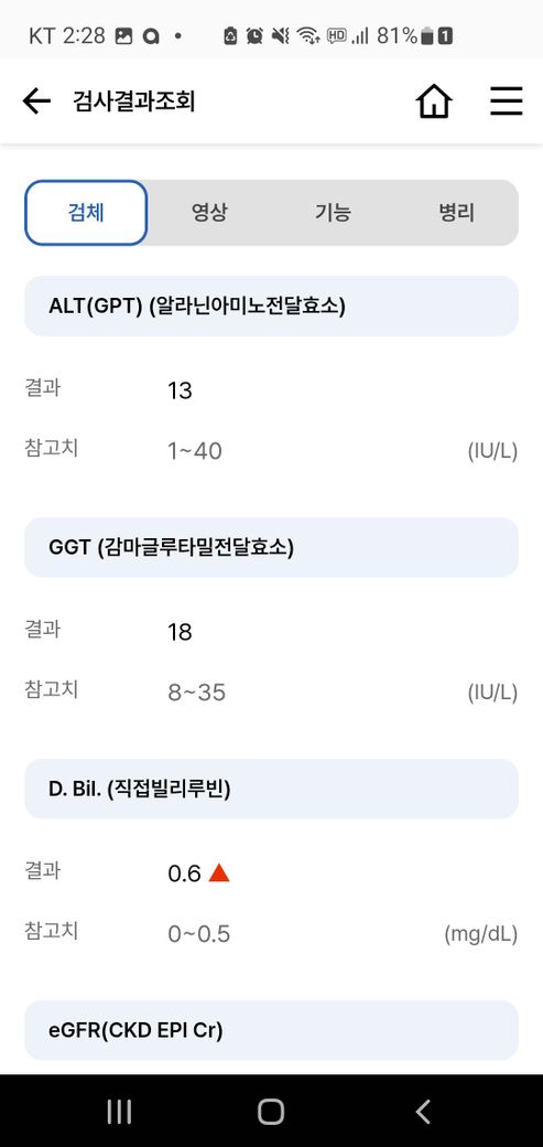 제 피검사 결과지인데요 빌리루빈이 좀 높습니다