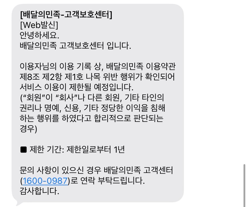 안녕하세요. 우선은 타인의 이익을 침해하는 행위가 있었기 때문에 서비스를 제한한다는 내용입니다 다만 소비자가 제재를 받는 이유 중에 가장 큰 이유가 악의적인 리뷰가 문제가 되는 경우도 있는데 만약 그러한 문제로 제재를 받는 것이라면 해당 업주가 영업방해죄를 물어 고소할 수도 있습니다. 그런 것이 아니라면은 단순히 서비스 이용을 제지당하는 수준으로 끝날 것으로 보입니다