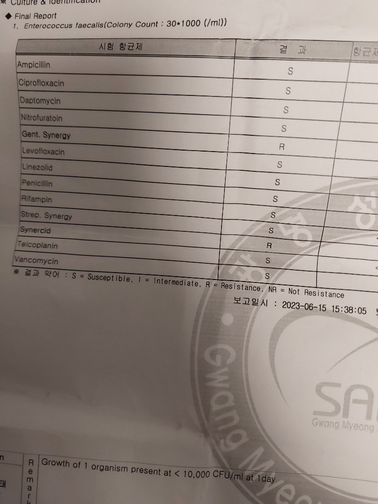 밑에 적혀있는 내용은 배양 첫번째 날에 한 종류의 균주가 10,000 CFU/ml로 나왔다는 것입니다. 균 감염을 의심해볼 수 있는 소견이며 내성이 없는 항생제로 치료하면 될 것으로 보입니다.