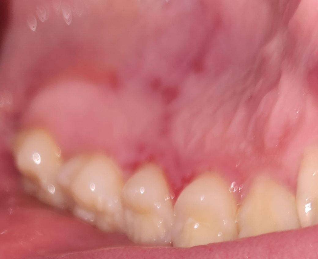 사진으로 봤을 경우에는 잇몸 조직에 염증이 생긴 것으로 보입니다. 몸이 피곤하거나 면역력이 약해지게 되면 점막 조직이 외부 자극에 취약해지면서 강한 자극에 의해서 사진처럼 염증이 생길 수 있습니다.