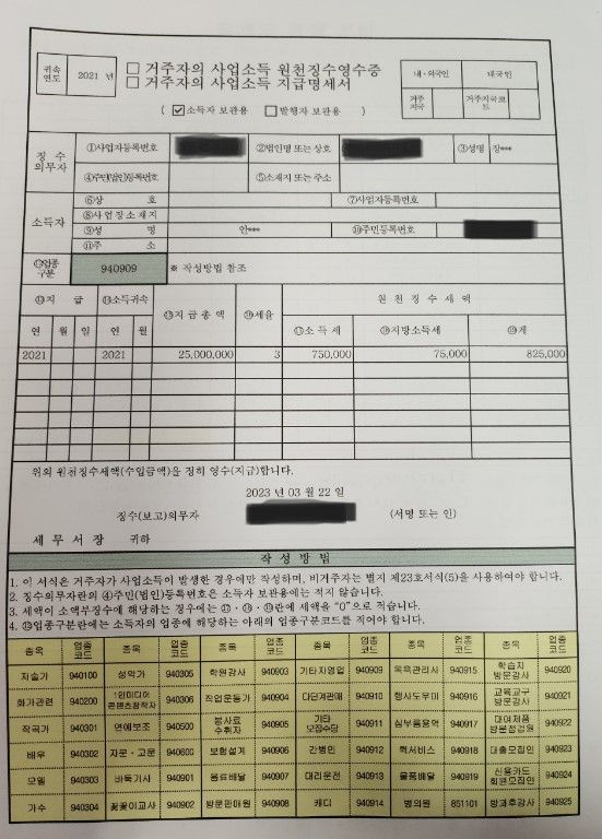 한국에서 개인에게 3.3% 원천징수 대상 자유직업소득이 있고 별도의 사업소득이