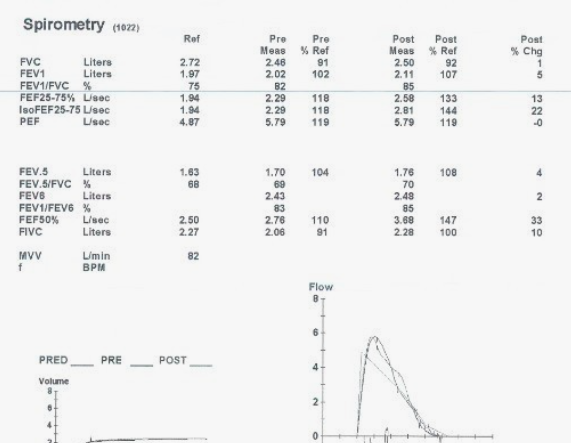 우선 폐기능검사는 PFT (pulmonary function test)인데 아래 그림에 보시는것과 같이 수치가 하나만 있는게 아니고 FVC (functional vital capacity), FEV1 (forced expiratory volume at 1 second) 등등 여러가지 결과치가 나오며 이걸 다 알아야 장애등급이 나오는지 여부를 알 수 있습니다.