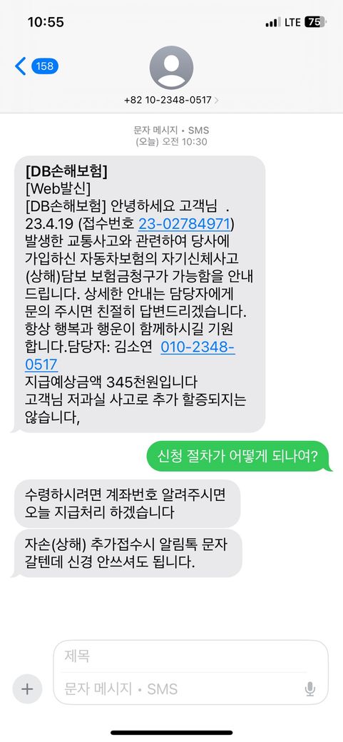 만일 의심이 조금이라도 되신다면 채팅이 아닌 직접 저 담당자에게 전화를 걸어서 보험사와 문자 보낸것이 맞냐고 물어보시면 되세요. 자동차 교통사고라면 처리하는 기간이 조금 긴 건 그럴 수 있습니다. 조사하는 기간이 있으니깐요.