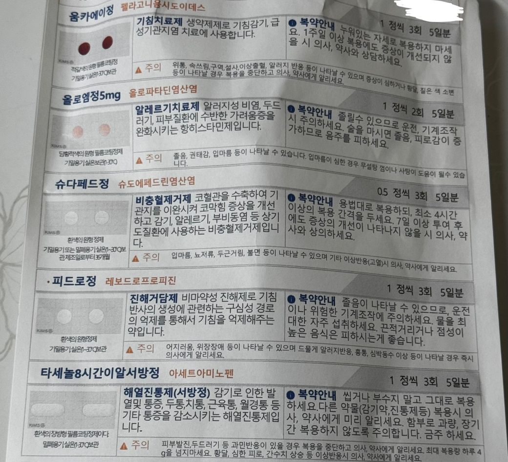 <움카에이정, 올로엠정 5mg, 슈다페드정, 피드로정, 타세놀 8시간 이알서방정> 이렇게 감기약을 섭취중이에요.