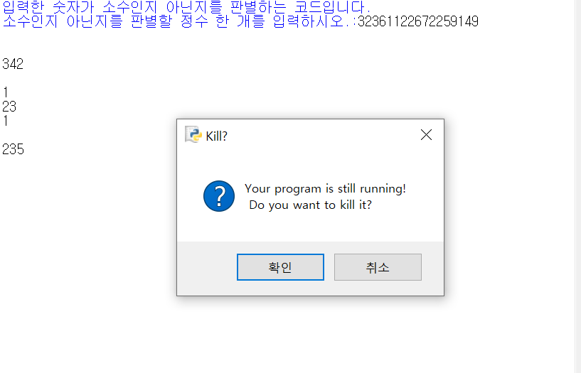 원래 소수면, 소수입니다. 소수가 아니면, 소수가 아닙니다. 이렇게 짠 코드입니다. 근데 가끔 이렇게 큰 숫자를 넣고 엔터를 치면 아무것도 안뜨고, 엔터를 쳐도 에러도 안나고, 저렇게 계속 숫자는 입력할 수 있게 되어있는데, 닫기 창을 누르면 저렇게 뜨고...