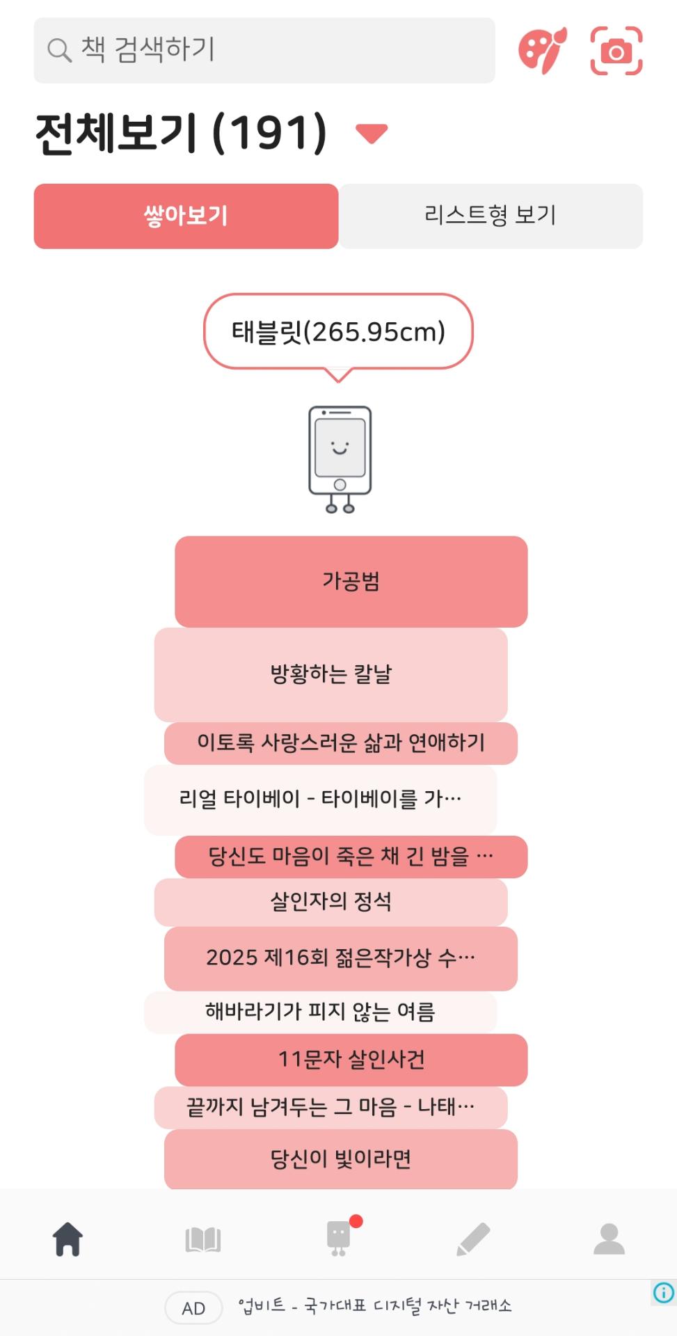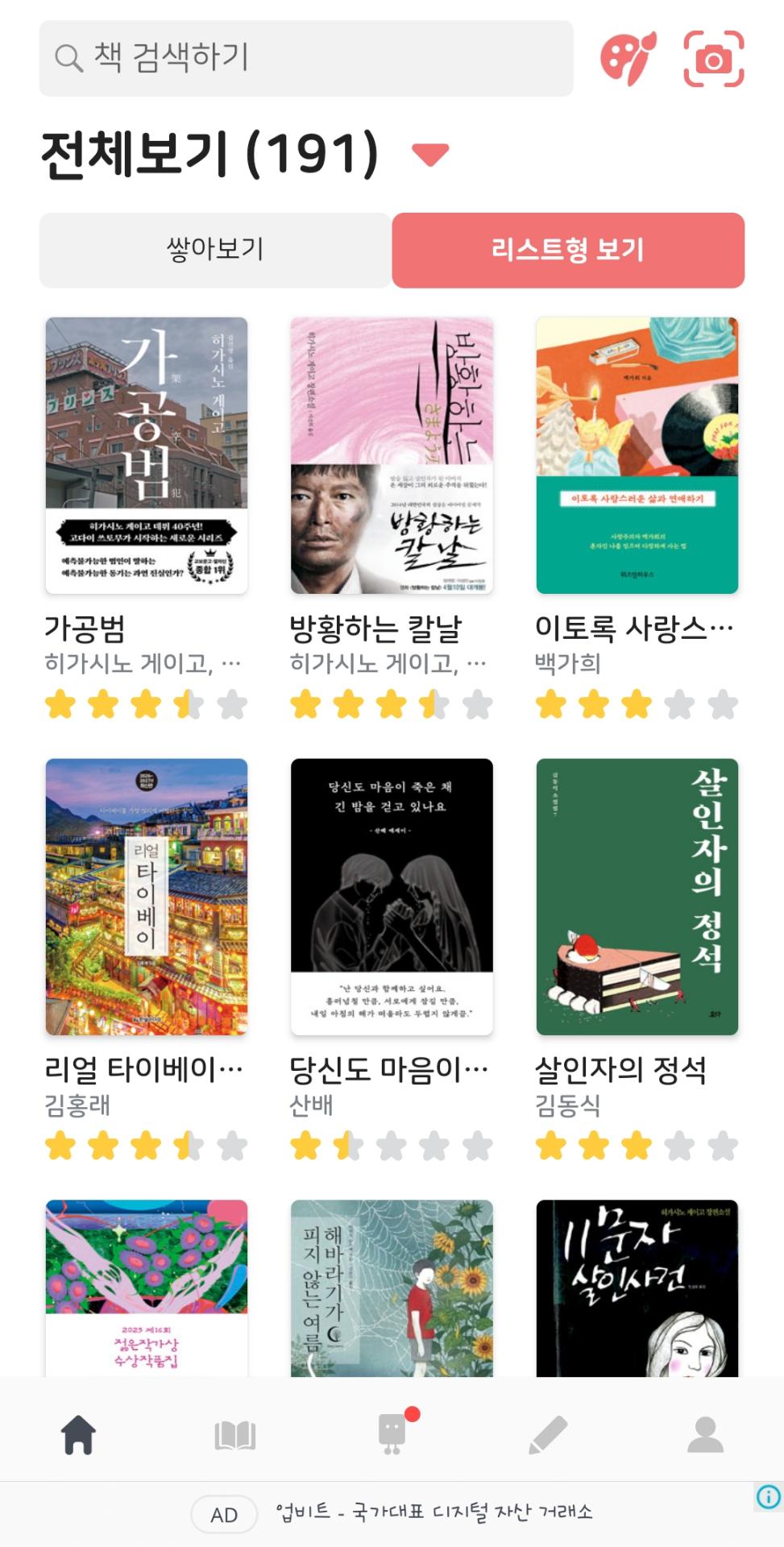 꾸준히 사용하고 있는 어플인데 내가 읽은 책을 쌓으면 몇cm인지 보는 재미도 있고 리스트형으로 보면 내가 준 별점과 함께 책표지가 나와서 눈애 바로 들어오더라구요!