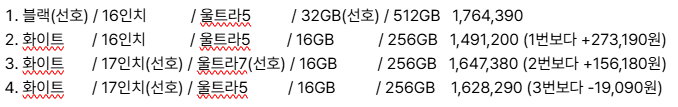 화이트 / 17인치(선호) / 울트라5 / 16GB / 256GB 1,628,290 (3번보다 -19,090원)