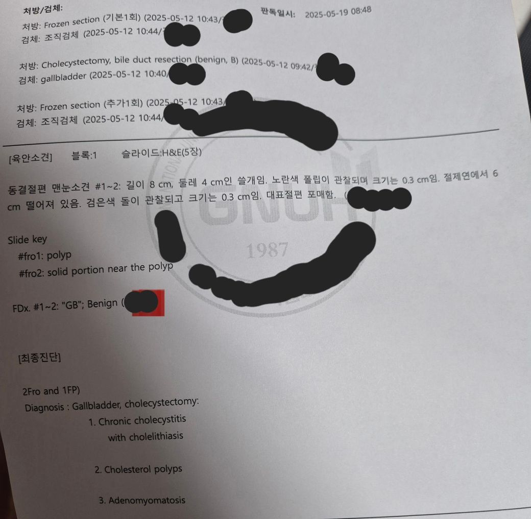 최종 진단에 보면 chronic cholecystitis 만성 담낭염과 cholesterol polyps 콜레스트롤 용종,