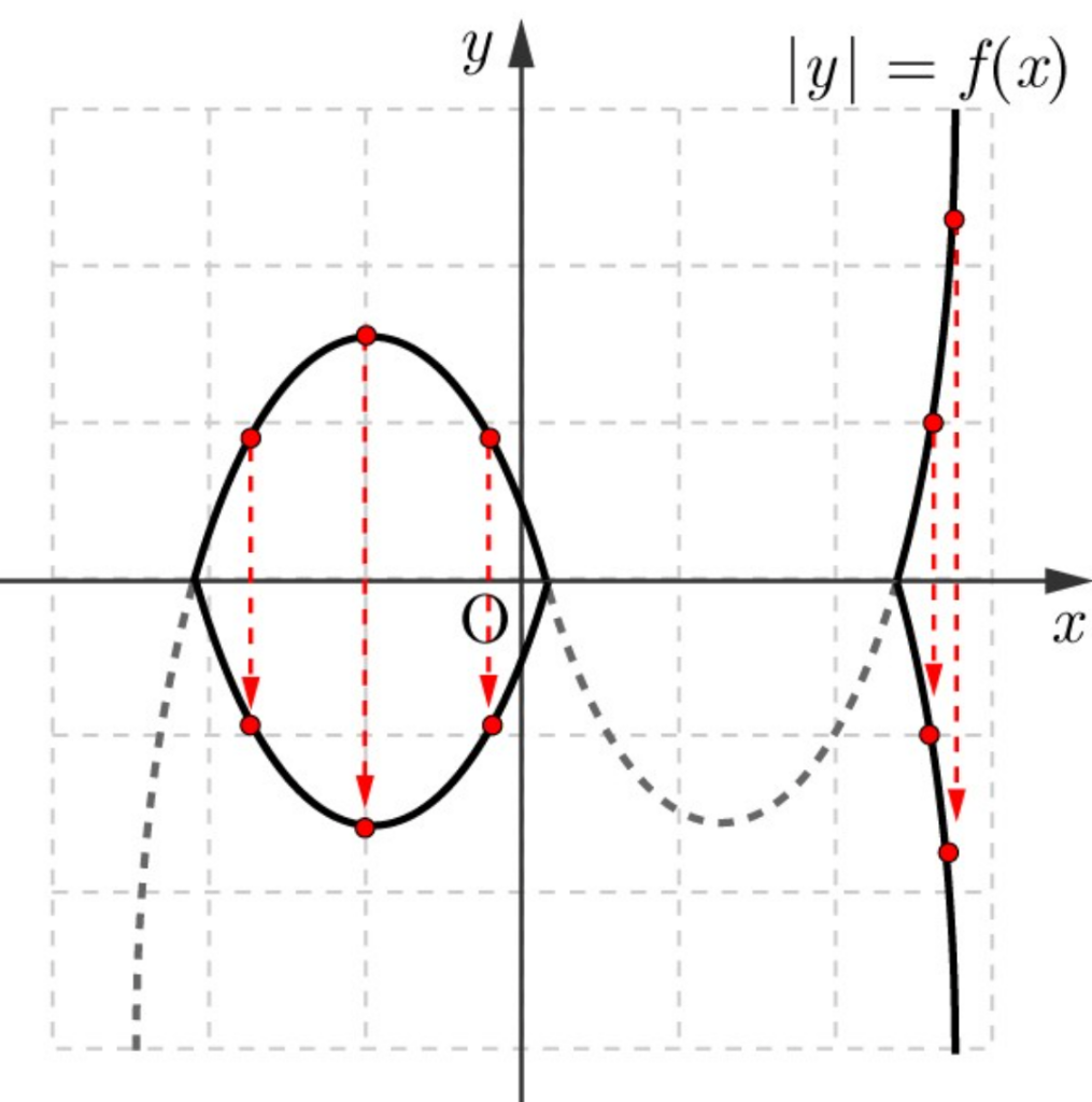 2. y<0, x축 아래로는 -f(x), 그러니까 f(x)를 위아래로 뒤집은 모양입니다. 뒤집은 뒤에 x축 위에를 지웁니다. 마찬가지로 지정 범위는 x축 아래니까요.
