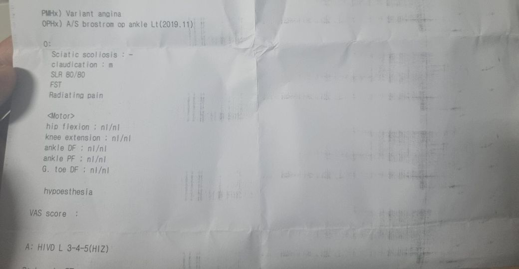 과거력 : 변이성 협심증, brostrom 수술, 좌측 발목 (발목의 외측 인대 손상 수술), 2019.11