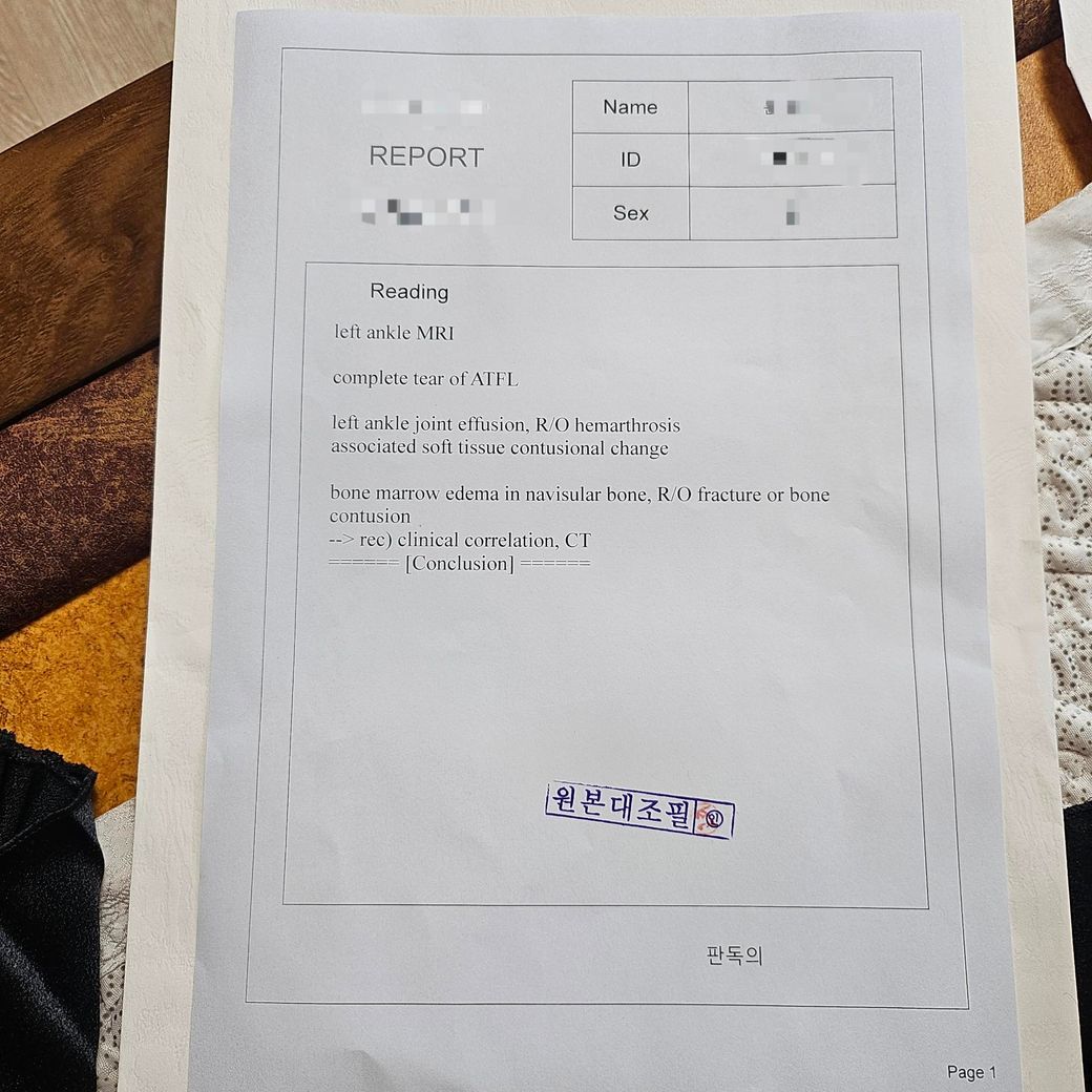 판독지상에서는 완전한 인대파열 및 골절이나 뼈타박상에 대한 의증이 작성되어 있는데요,