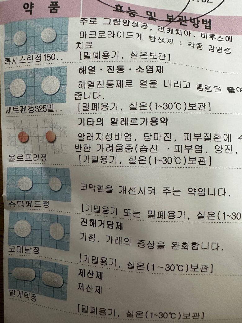 -이비인후과 약은 록시스린정(록시트로마이신. 항생제), 세토펜정(아세트아미노펜. 해열진통제), 올로프리정(올로파타딘염산염. 항히스타민제), 슈다페드정(슈도에페드린. 비충혈제거제), 코데날정(클로르페니라민말레산염+디히드로코데인타르타르산염+DL-메틸에페드린염산염+구아이페네신. 기침가래), 알게텍정(알마게이트. 제산제) 성분입니다.