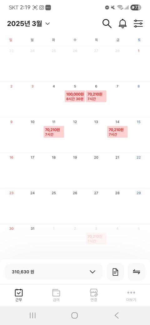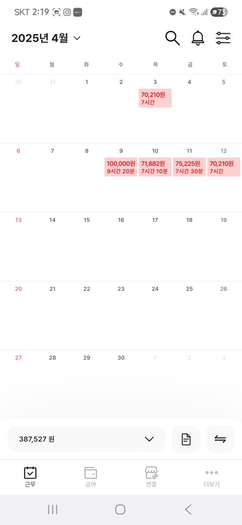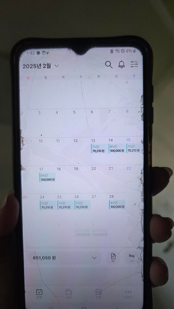그래서 2월달은 13일부터 8번나갔고 3월달은 4번 나갔습니다(5일,6일,11일14일) 3월15일부터 4월2일까지 안나갔고 4월(3일9일10일12일)나갔습니다