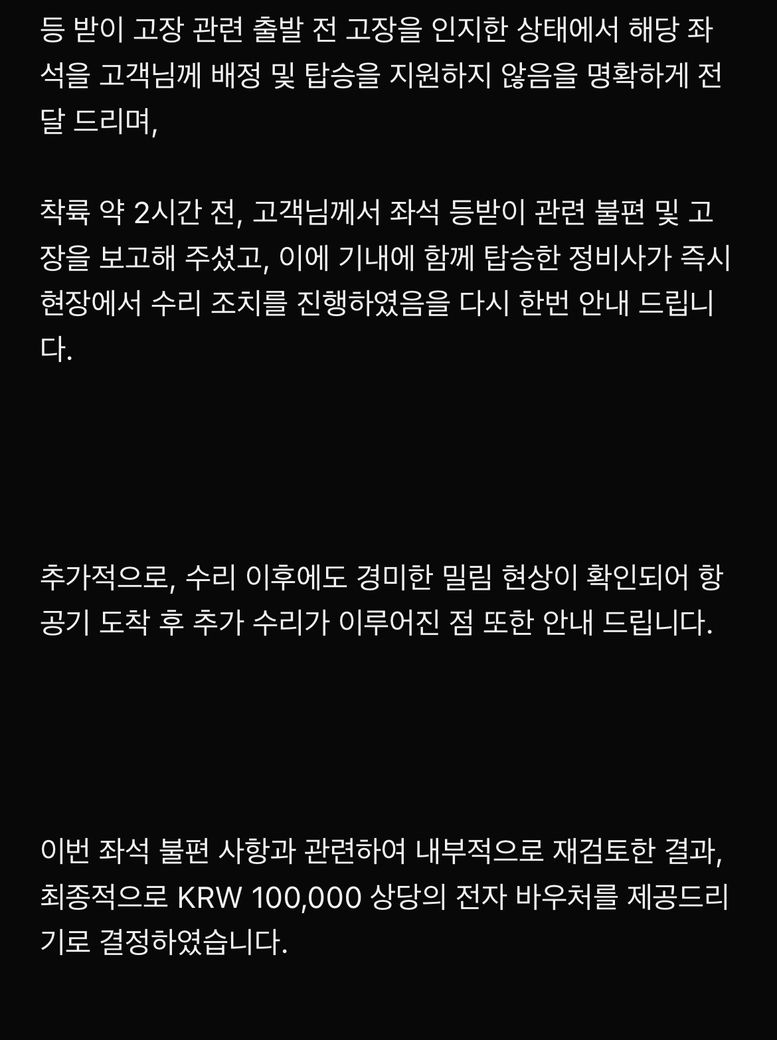 비행기 좌석 고장으로 인한 보상방법에 대해 문의드립니다