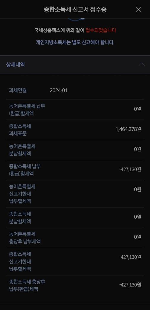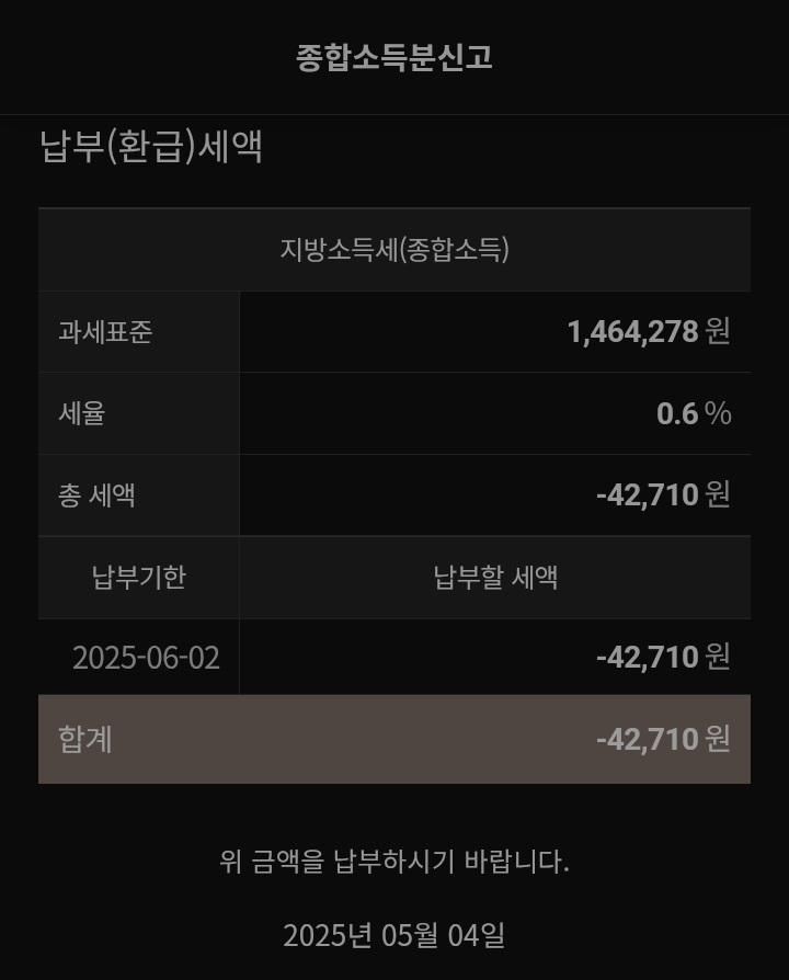 첨부해주신 자료를 확인해보면 소득세 환급액 42만원, 개인지방소득세 환급액 4만원으로 추가로 납부하시는 금액은 없고 오히려 돌려받으시는 금액으로 생각됩니다. 납부액은 보통 플러스 금액, 환급액은 마이너스 금액으로 표시가 됩니다.