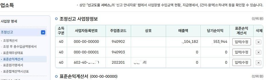 여러코드의 업종을 복식부기 장부 하나 안에 모두 작성했다면, 조정계산서 조정후수입금액명세서. 재무상태표, 손익계산서 등등도 하나로 작성해도 맞다고 안내해주셨는데요. 지금 해보니까 각 표들이 모두 맨 위 업종코드에 다 적히고 나머지 업종들을 0원으로 표시되는데 이렇게 표시되어도 되는 건가요? (여긴 모두가 볼 수 있는 곳이라 일부정보는 지웠습니다.)