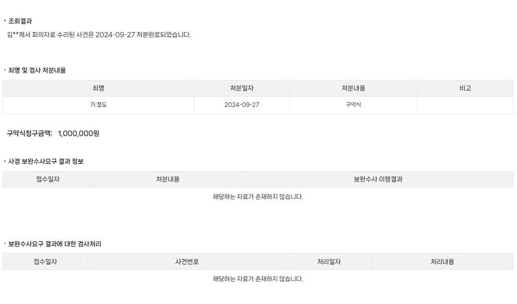 2024년 핸드폰을 도둑 맞은 뒤 형사사건을 거쳐 검찰로 넘어갔는데 아래 사진과 같이 나오고 법원에서는 사건이 조회가 안되는데 이렇게 된 경우 피의자에게 절도죄가 성립되고 1000만원의 벌금이 내려진 걸로 종결이 난건가요 ? 또한 제가 보상을 받으려면 손해배상 청구 소송을 걸어야 하나요 ?