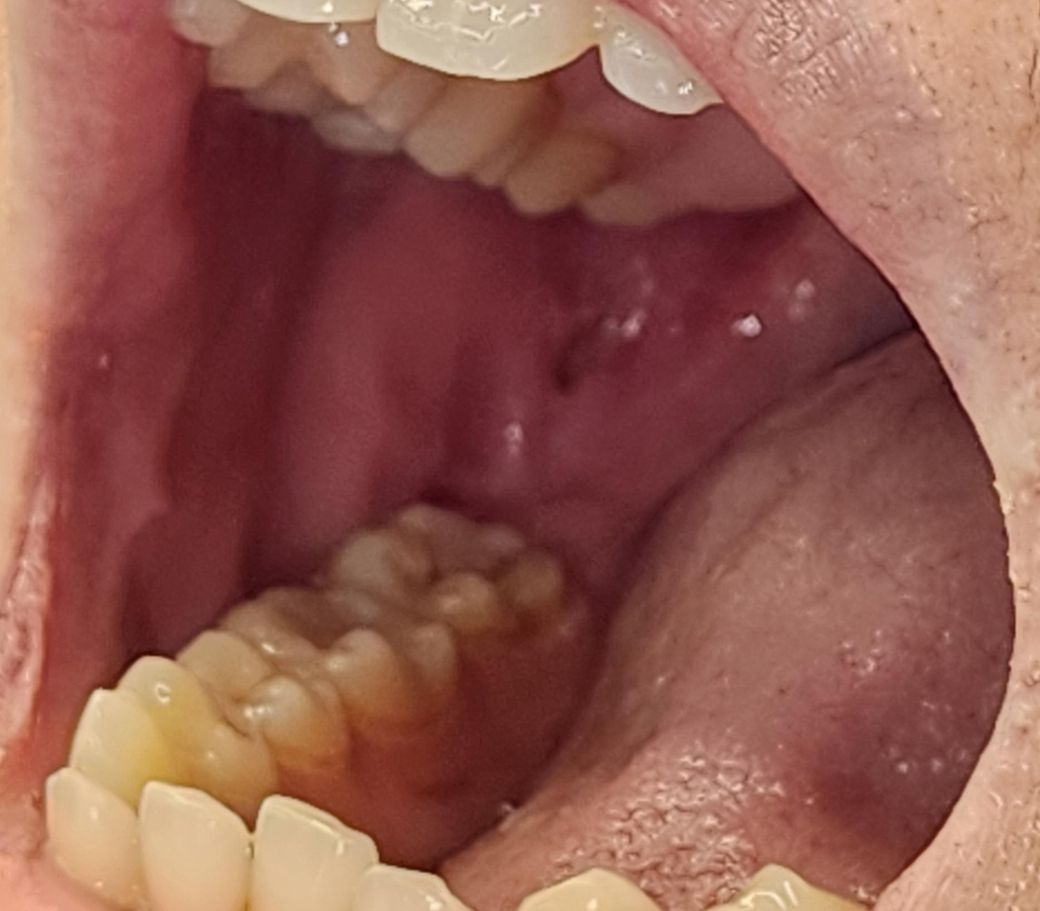 사진상으로 명확히 보이진 않지만 구내염을 말씀하시는거 같습니다. 컨디션 저하에 의해 생기는 것으로 약 복용하며 쉬면 금방 회복 될 것입니다.