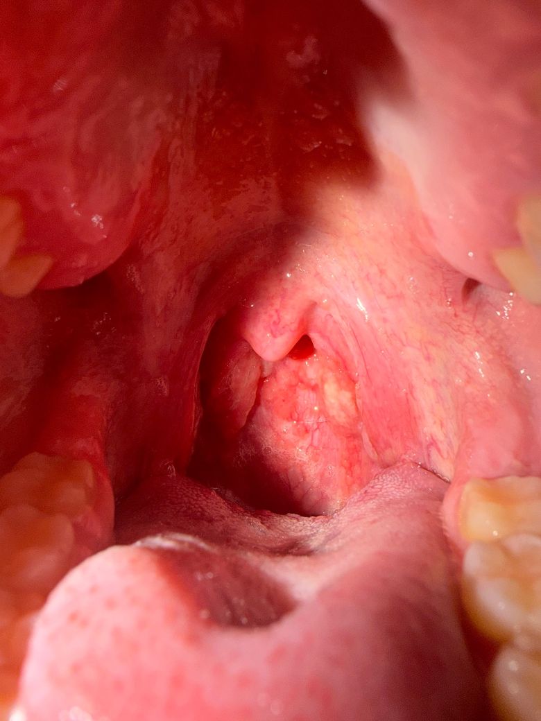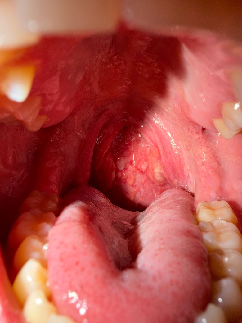 사진상 후인두벽이 전반적으로 발적되어 있고, 작은 결절성 돌기들이 다수 보입니다. 편도 비대나 명확한 화농성 삼출(고름)은 뚜렷하지 않습니다. 임상적으로는 급성 세균성 편도염보다는 바이러스성 인두염 또는 후비루(post-nasal drip)와 연관된 림프조직 반응(일명 cobblestone appearance)에 더 합당한 소견입니다.
