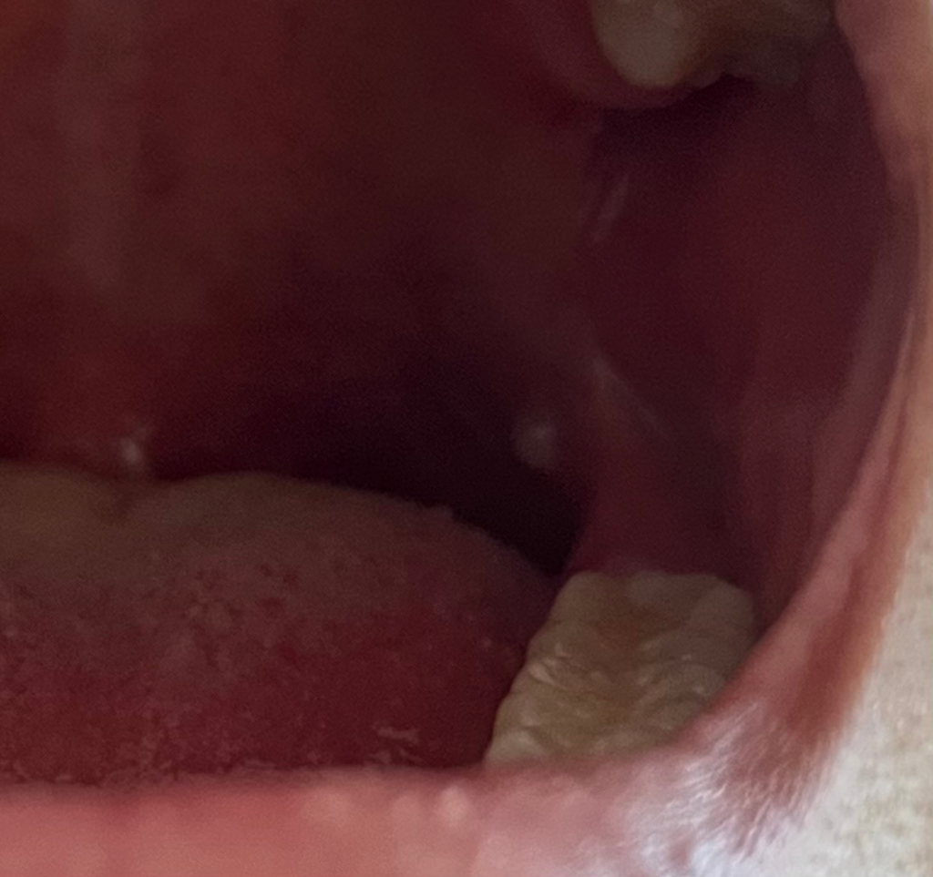 하얀 무언가가 보이는데 낭성 종양같기도 하고 구내염같기도 합니다. 잘 보이지 않으니 이비인후과를 방문해 평가받아보시기 바랍니다.