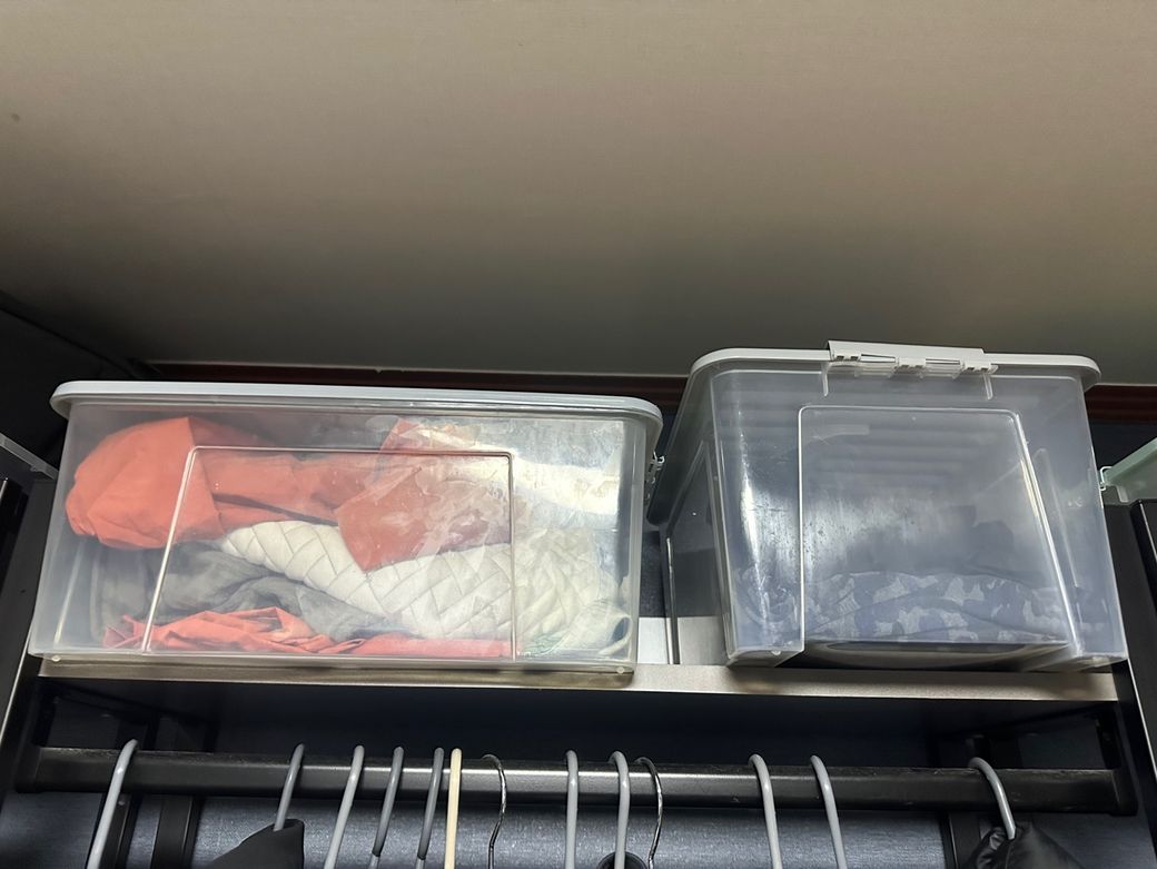 다이소에서 흔히들 판매하는 투명한 플라스틱 수납정리함에 계절용 옷이나 침구류를 보관하는데요.